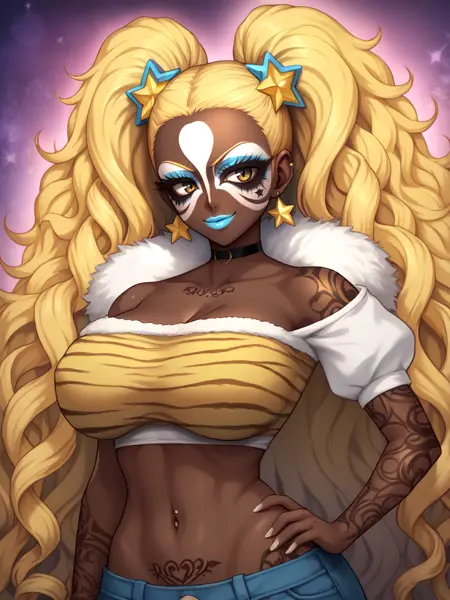 (for face detailer prompt, you can use Score_9, score_8_up, score_7_up, score_6_up, source_anime, 1girl, solo, masterpiece, nose piercing, ear piercing, dark-skinned female, BREAK, (yamanba, white facepaint makeup), star stickers, heart stickers, eyeshadow, very dark skin, (glitter, long thick eyelashes), lora:Yamanba\_Face:0.75)
