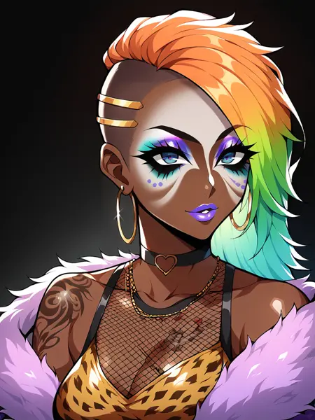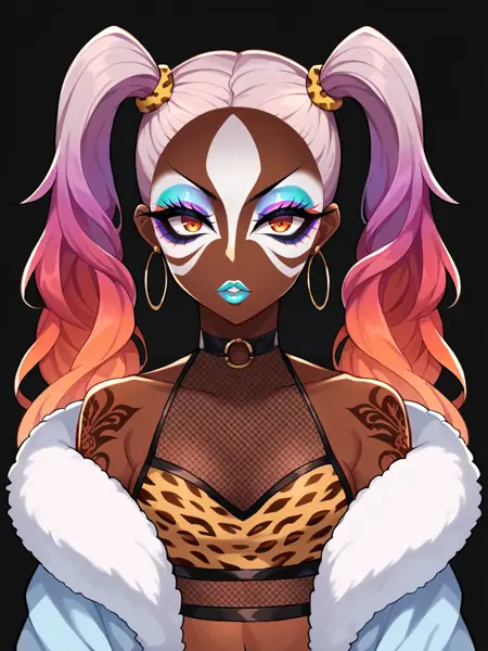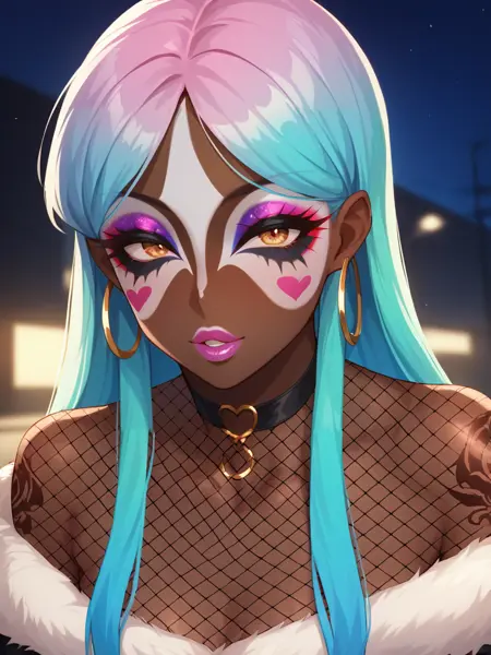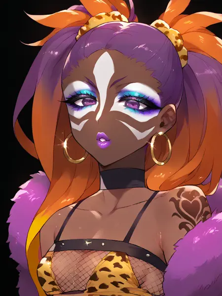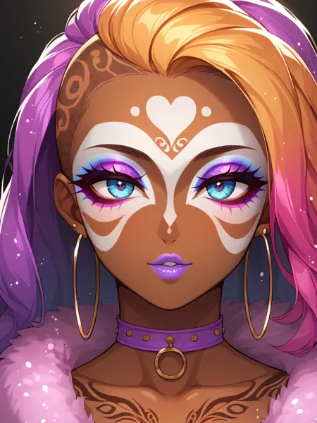 (对于面部细节提示,你可以使用:Score_9, score_8_up, score_7_up, score_6_up, source_anime, 1girl, solo, masterpiece, nose piercing, ear piercing, dark-skinned female, BREAK, (yamanba, white facepaint makeup), star stickers, heart stickers, eyeshadow, very dark skin, (glitter, long thick eyelashes), lora:Yamanba_Face:0.75)