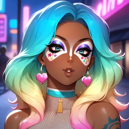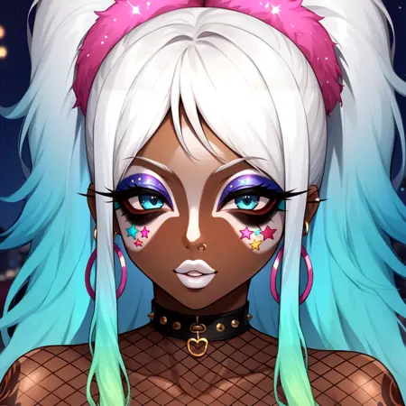 (顔詳細化用プロンプト:Score_9、score_8_up、score_7_up、score_6_up、source_anime、1girl、solo、masterpiece、鼻ピアス、耳ピアス、濃い肌の女性、BREAK、(yamanba、白い化粧)、星のステッカー、ハートのステッカー、アイシャドウ、非常に濃い肌、(グリッター、長く濃いまつげ)、lora:Yamanba_Face:0.75)