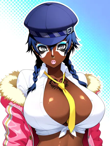 (얼굴 디테일러 프롬프트에는 Score_9, score_8_up, score_7_up, score_6_up, source_anime, 1girl, solo, masterpiece, 코 피어싱, 귀 피어싱, 검은 피부 여자, BREAK, (yamanba, 흰 메이크업), 별 스티커, 하트 스티커, 아이섀도우, 매우 짙은 피부, (글리터, 길고 두꺼운 속눈썹), lora:Yamanba_Face:0.75를 사용할 수 있습니다.)