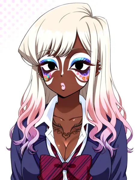 Gyaru용: 더 낮은 가중치, 키워드 "Gyaru" 및 다음 태그 사용: 긍정: 탐색된 피부, 부정: (흰 메이크업, 흰 아이섀도우)
