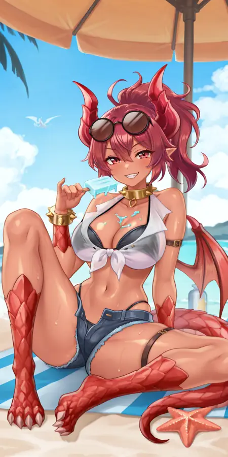 主なタグ:dragongirl、尖った耳、赤髪、赤い目、非常に長い髪/ポニーテール、ドラゴンの翼、ドラゴンの尾、ドラゴンの角、ドラゴンの爪、うろこ
