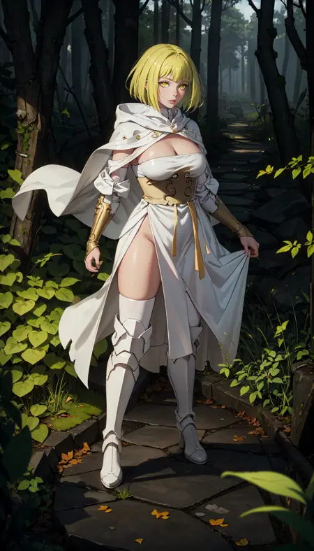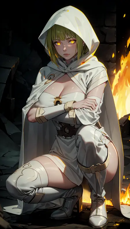short hair, blonde hair, yellow eyes, white outfit, white cape, white hood, white boots