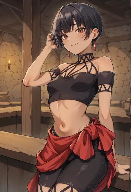 Notable tags: dark skin, short hair, black hair, brown eyes, earrings, jewelry, black crop top, black shorts, bare shoulders, red sarong,