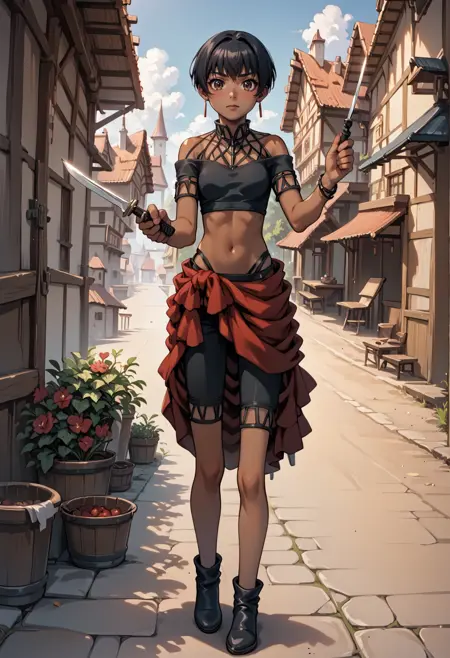Notable tags: dark skin, short hair, black hair, brown eyes, earrings, jewelry, black crop top, black shorts, bare shoulders, red sarong,