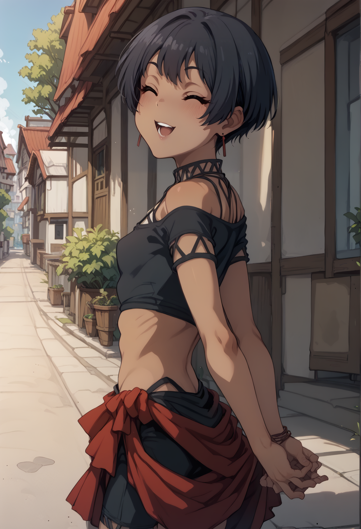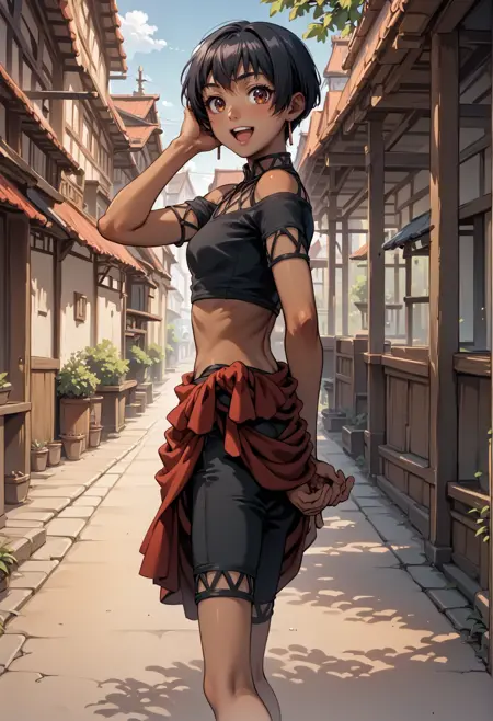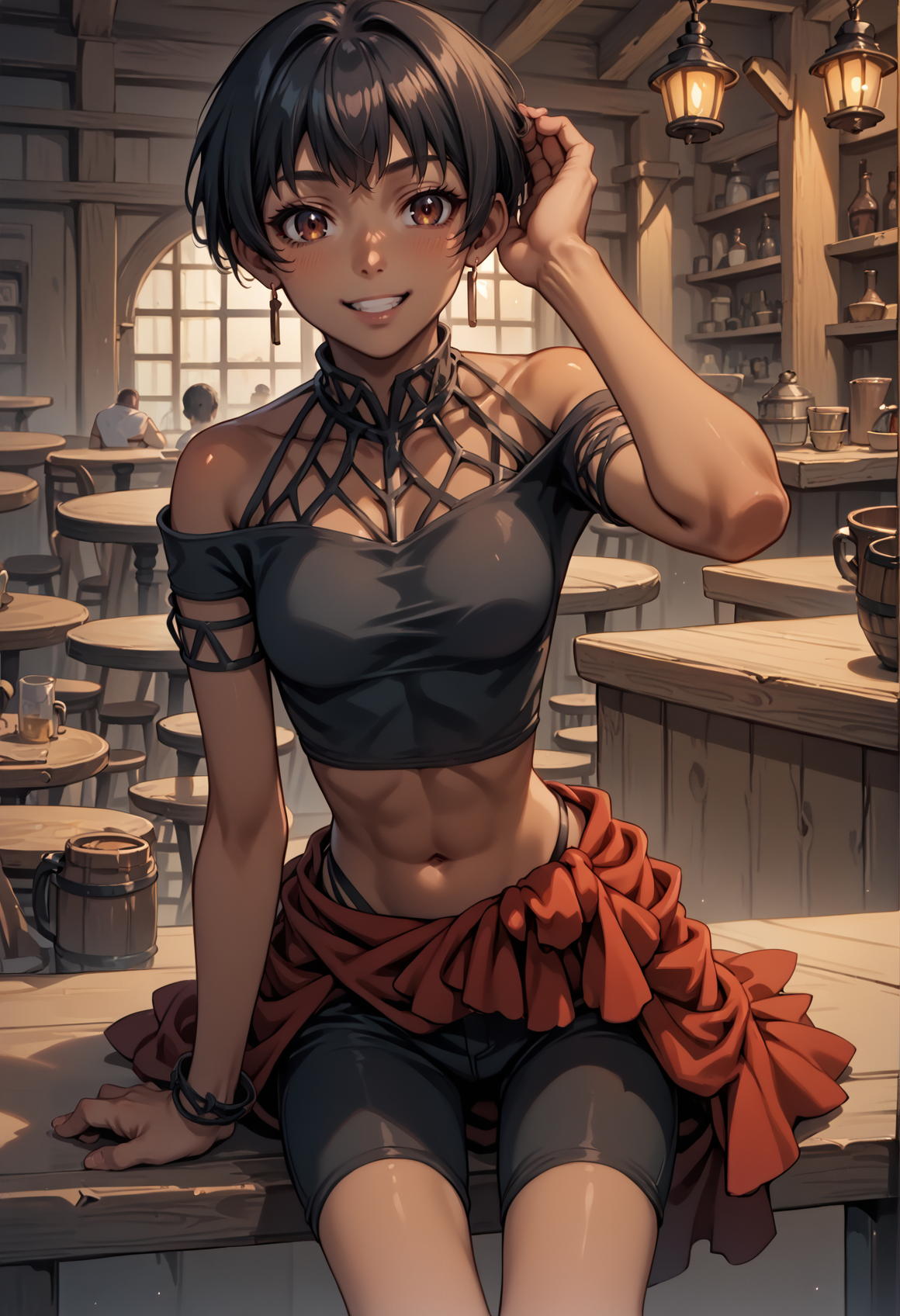 주요 태그: 검은 피부, 짧은 머리, 검은 머리, 갈색 눈, 귀걸이, 보석, 검은 크롭탑, 검은 반바지, 어깨 노출, 빨간 사롱,