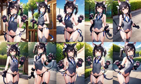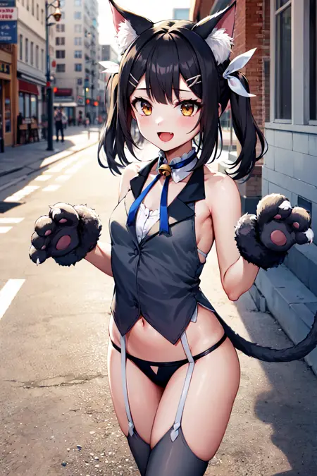outfit2bbmiyu, twintails, hair ribbon, animal ears, hairclip, small breasts, cat tail, bare shoulders, detached collar, neck ribbon, bell, grey vest, sleeveless, animal hands, paw gloves, black panties, garter straps, grey thighhighs