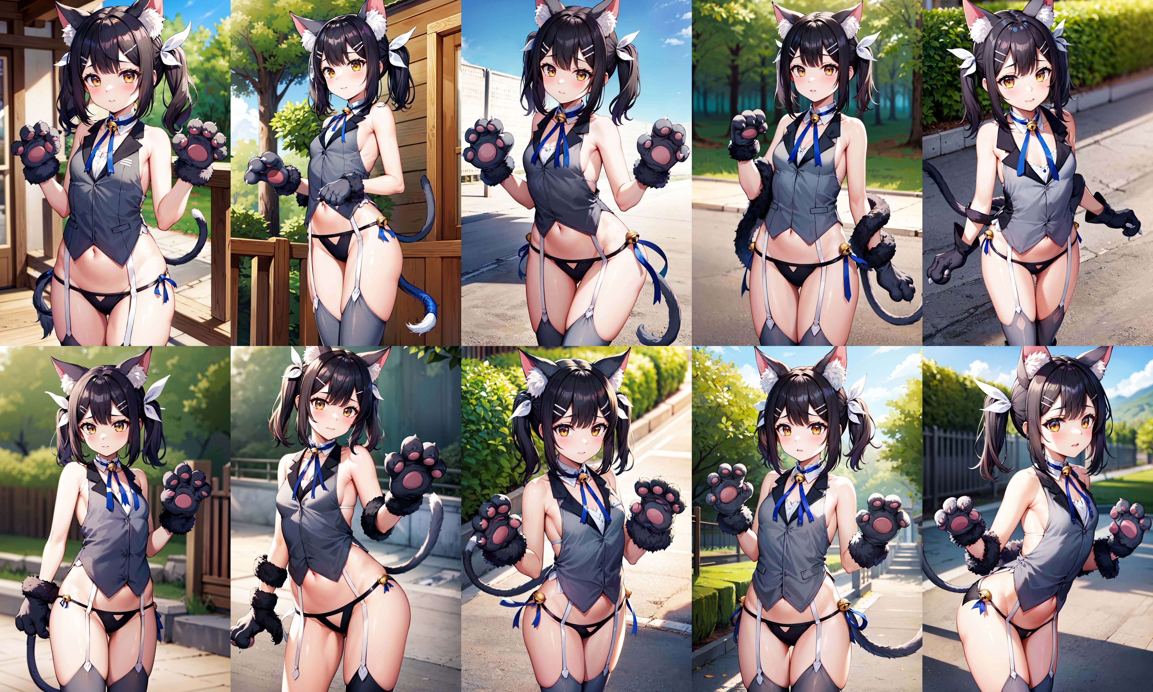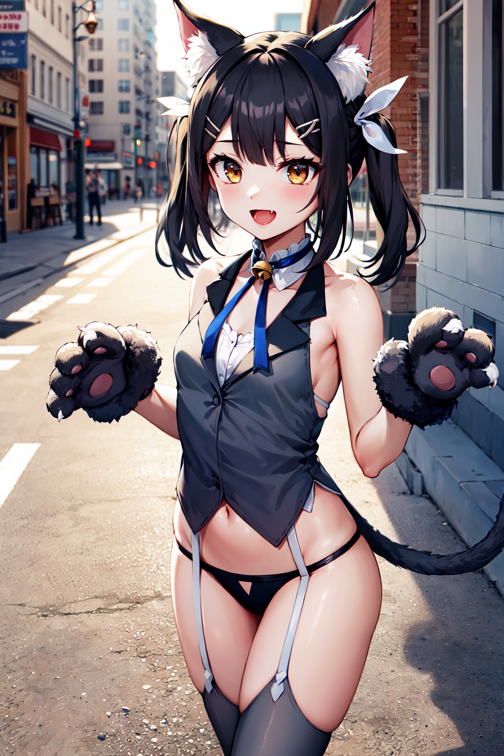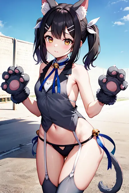 아웃핏2bbmiyu, 트윈테일, 헤어리본, 동물 귀, 헤어클립, 작은 가슴, 고양이 꼬리, 어깨 노출, 분리된 칼라, 목 리본, 종, 회색 조끼, 민소매, 동물 손, 발톱 장갑, 검은 속옷, 가터 스트랩, 회색 허벅지 양말