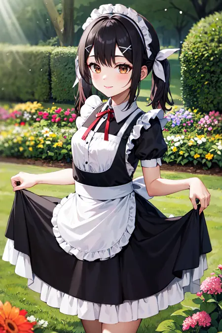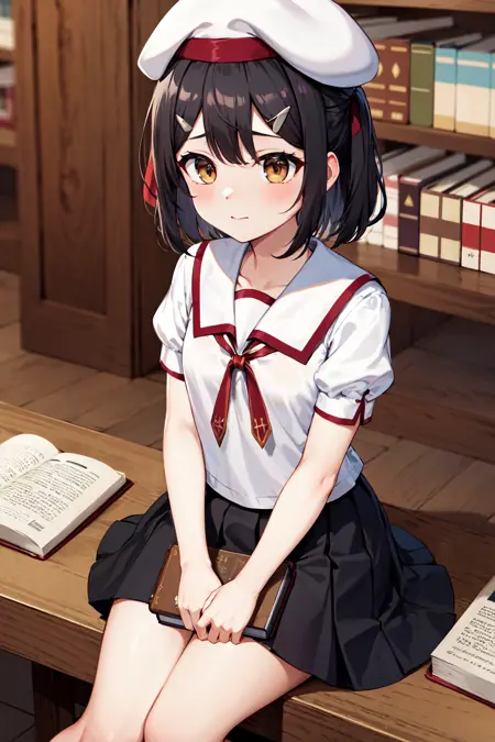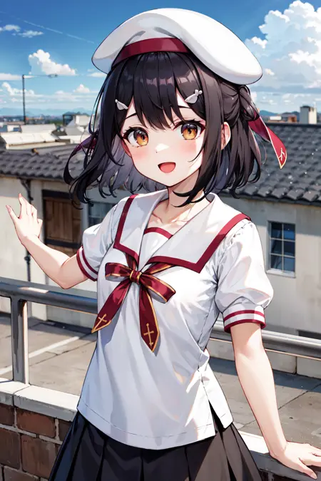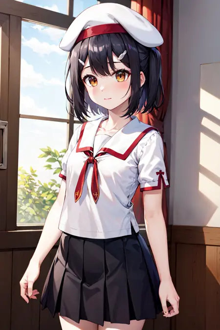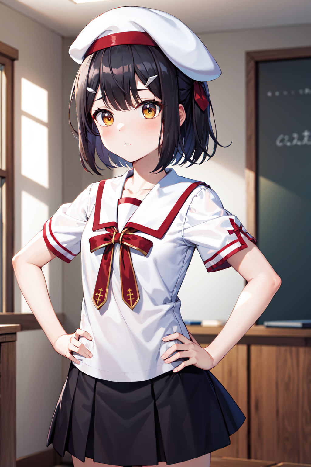 아웃핏3ccmiyu, 단발, 베레모, 흰색 머리 장식, 헤어 장식, 작은 가슴, 어깨뼈, 목 리본, 빨간 리본, 흰색 해군 칼라, 흰색 셔츠, 풍선 소매, 짧은 소매, 학교 유니폼, 주름치마, 검은 치마