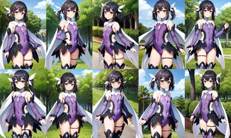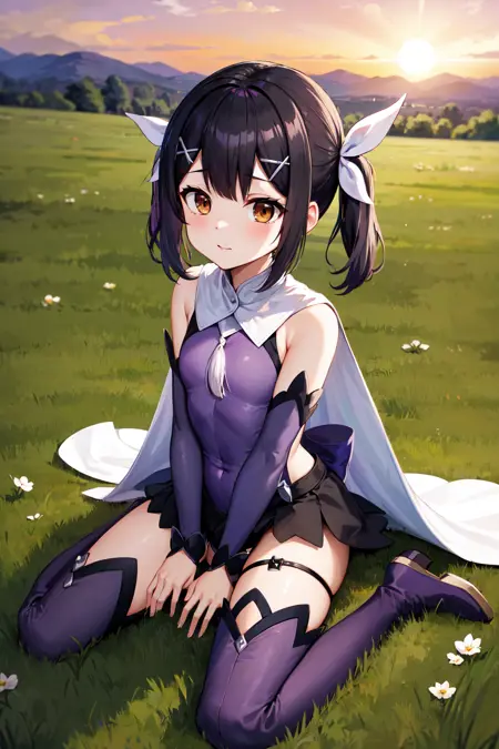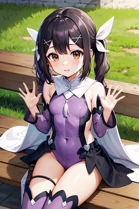 outfit1aamiyu, twintails, hair ribbon, x hair ornament, brown eyes, small breasts, magical girl, white cape, purple leotard, detached sleeves, purple sleeves, showgirl skirt, thigh strap, purple thighhighs