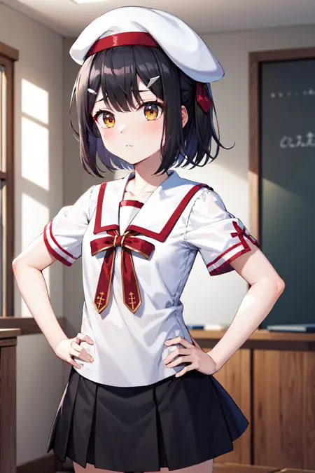 outfit3ccmiyu, short hair, beret, white headwear, hair ornament, small breasts, collarbone, neck ribbon, red ribbon, white sailor collar, white shirt, puffy sleeves, short sleeves, school uniform, pleated skirt, black skirt