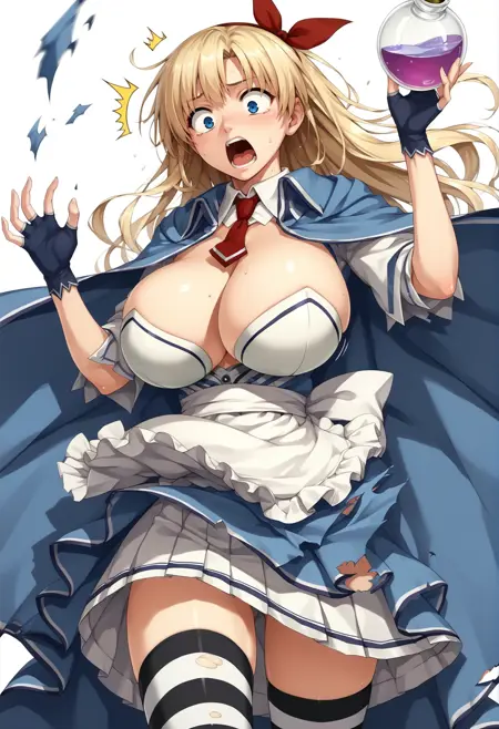 金发,长发,发带,蓝眼睛,分离式衣领,领结,连衣裙,胸部暴露,迷你裙,围裙,短袖,斗篷,绝对领域,条纹过膝袜,露指手套,