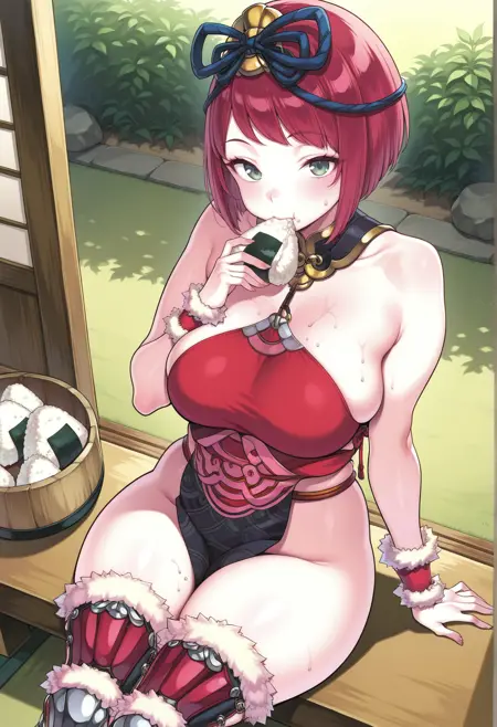 short hair, red hair, green eyes, hair ornament, revealing clothes, pelvic curtain, wristband, toeless legwear, fur trim, armor