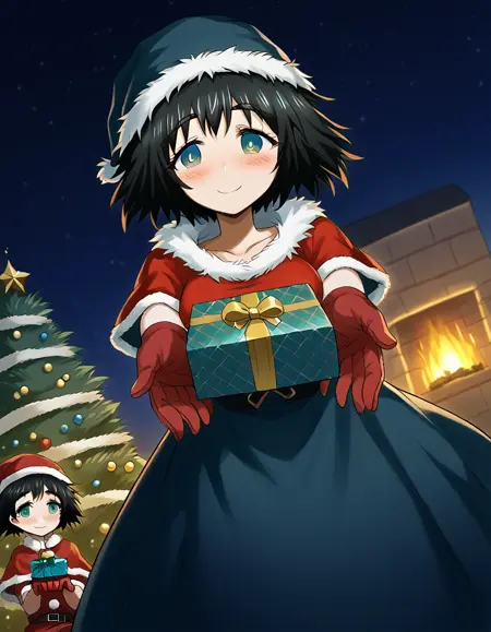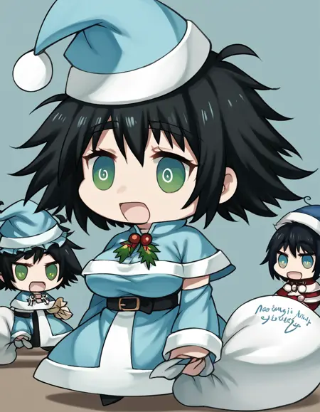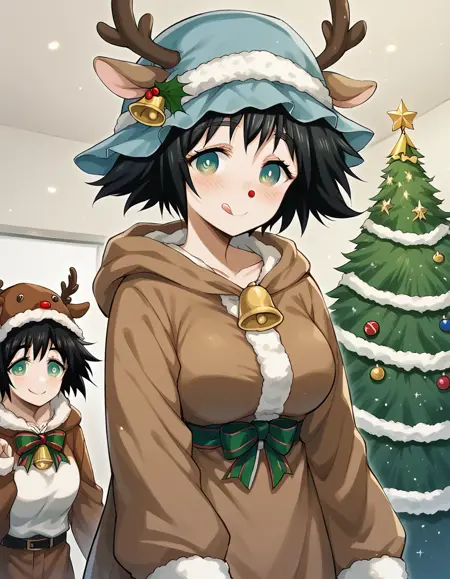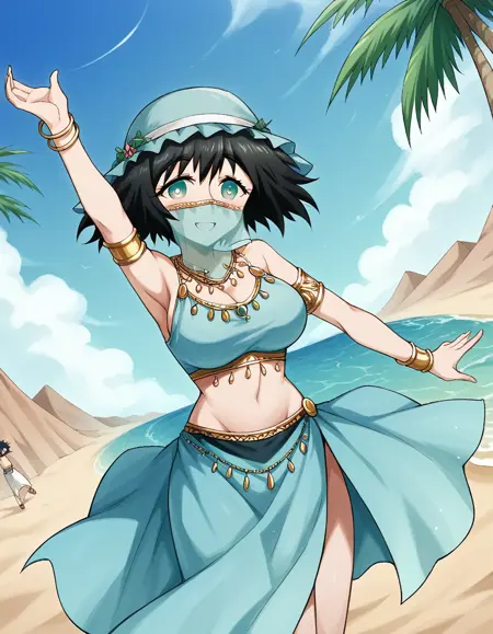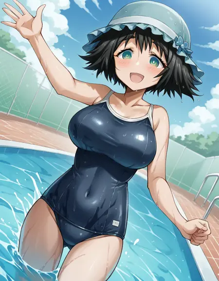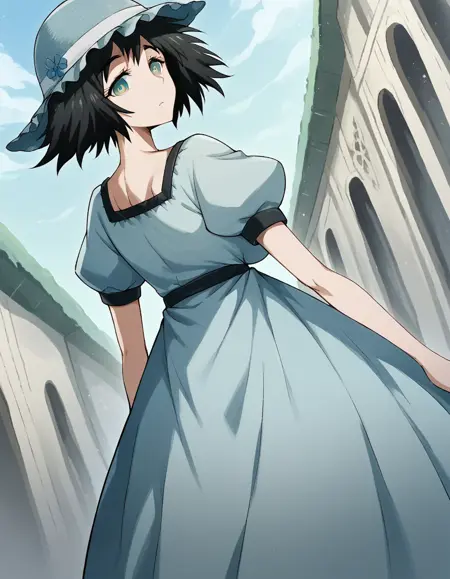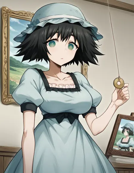 mayuri shiina, black hair, green eyes, messy hair, short hair, hat, blue hat,