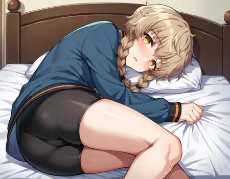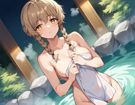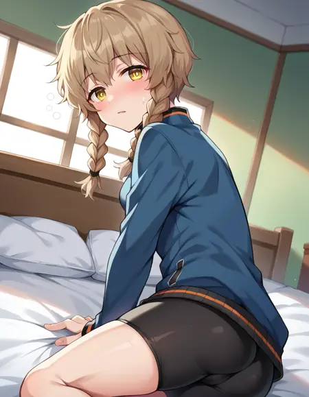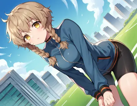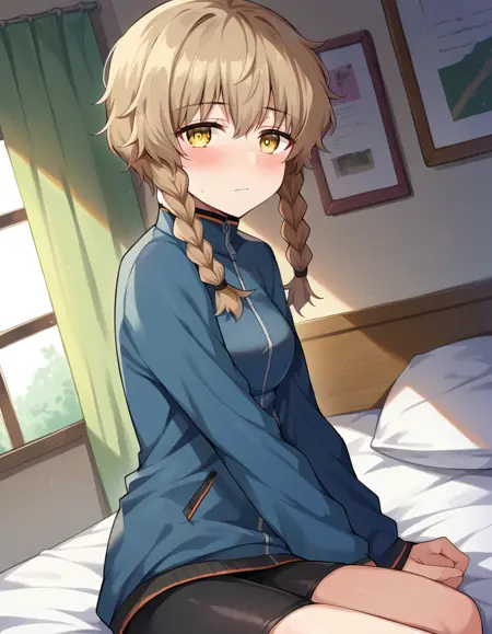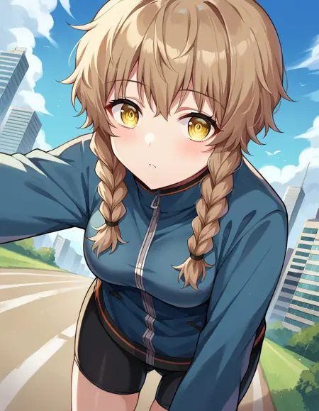 suzuha amane, bangs, brown hair, yellow eyes, braid, twin braids,