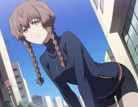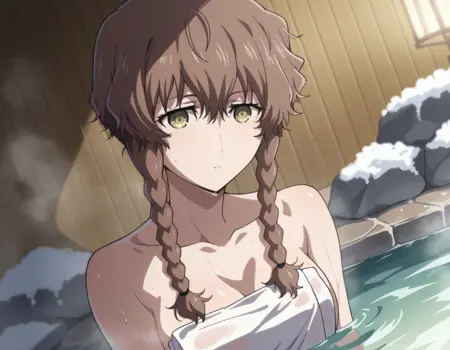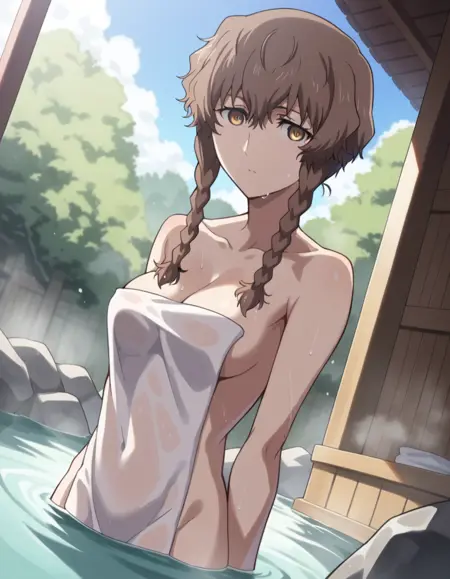 suzuha amane, bangs, brown hair, yellow eyes, braid, twin braids,