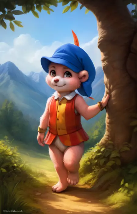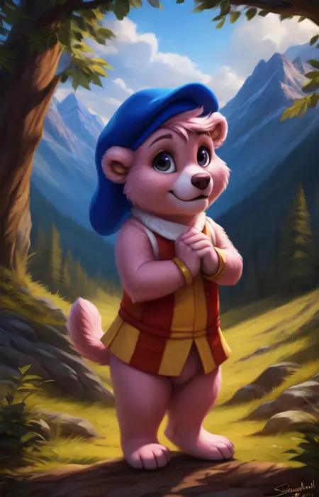 CubbiGummiCartoon, hat, feather on hat with button, blouse, pink wool,