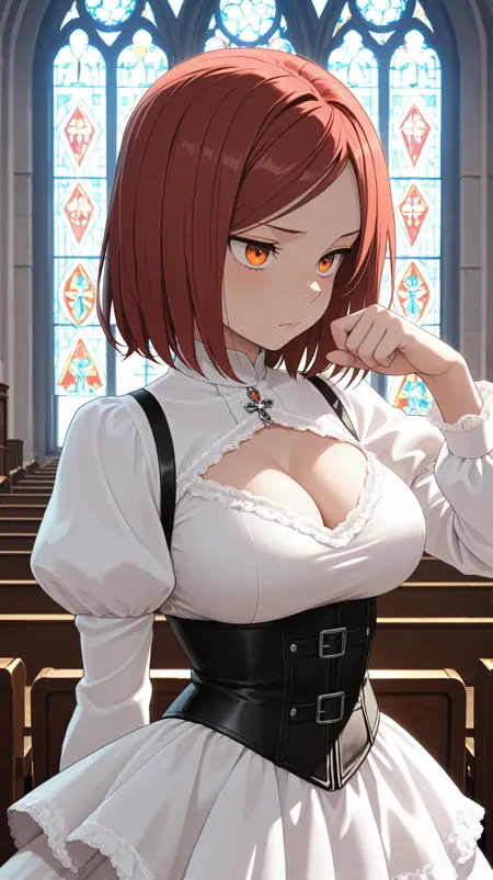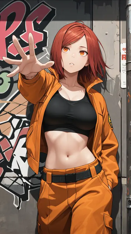中等长度头发,红发,橙色眼睛,橙色连体服,橙色夹克,敞开式夹克,黑色上衣,