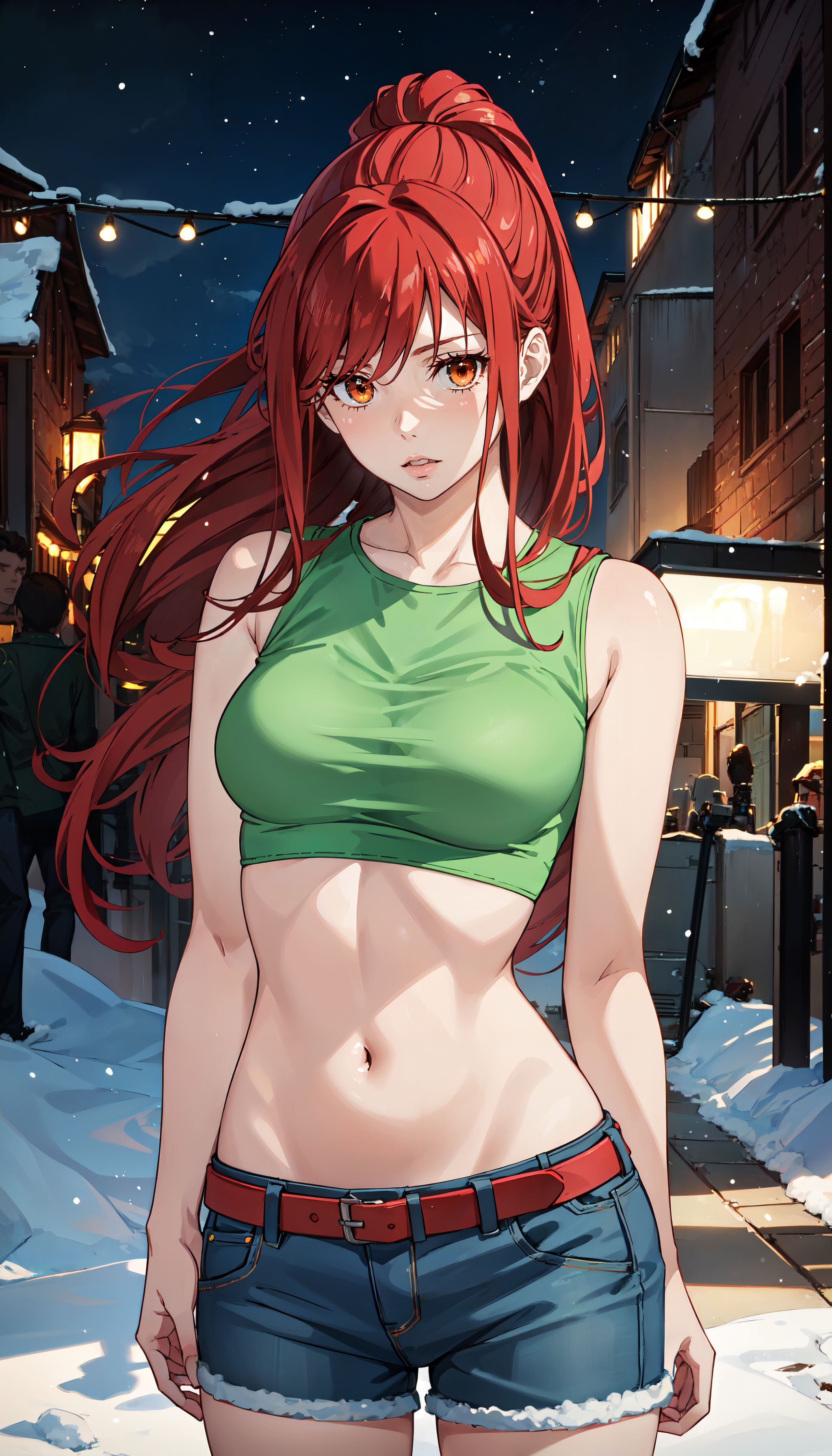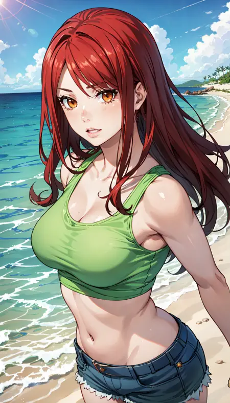 long hair, red hair, bangs, orange eyes, green top, denim shorts