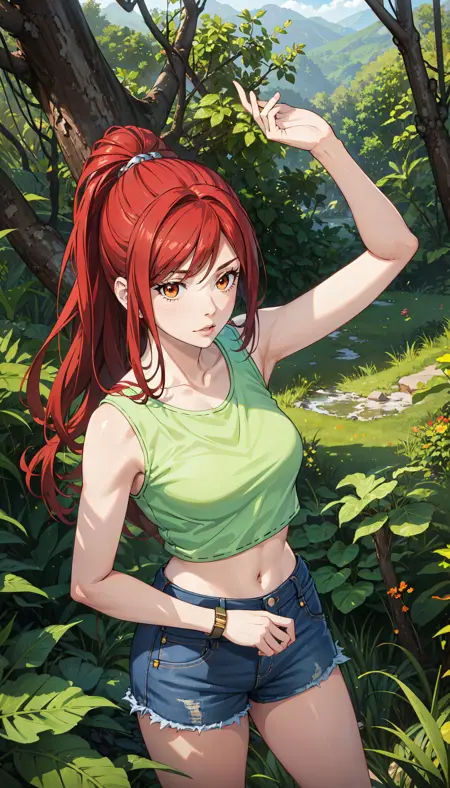 long hair, red hair, high ponytail, sidelocks, orange eyes, green top, jean shorts, striped arm tattoo,