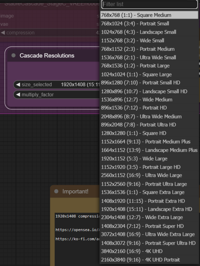 많은 사용자들이 첫 번째 실행 후 끔찍한 이미지 품질 때문에 Stable Cascade 사용을 포기합니다... 왜 그럴까요? 웹에 공개된 워크플로우에는 마지막으로 사용된 입력 이미지 크기(예: 1560x1560px)에 대한 압축 설정이 포함되어 있기 때문입니다. 제 관찰에 따르면(RTX 3060 TI), 입력 크기가 클수록 압축률을 더 높게 설정해야 합니다.