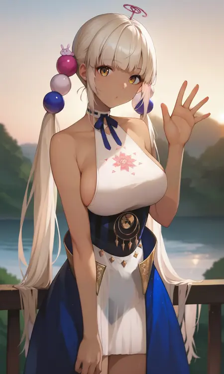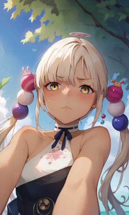 tsukumo_sana, 浅棕色头发, 发饰, 双马尾, 深肤色女性, 裸露肩膀, (大乳房:0.8)