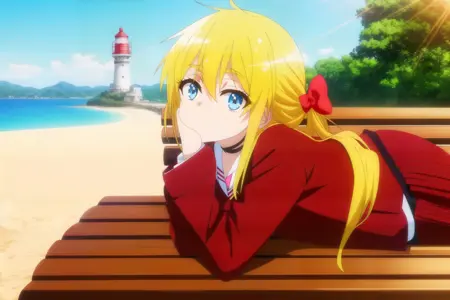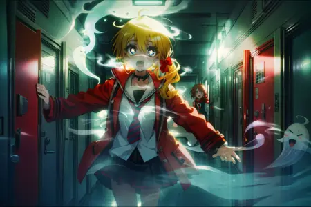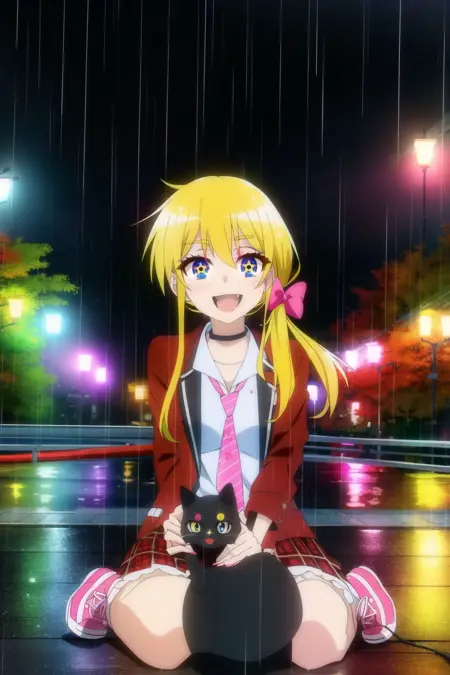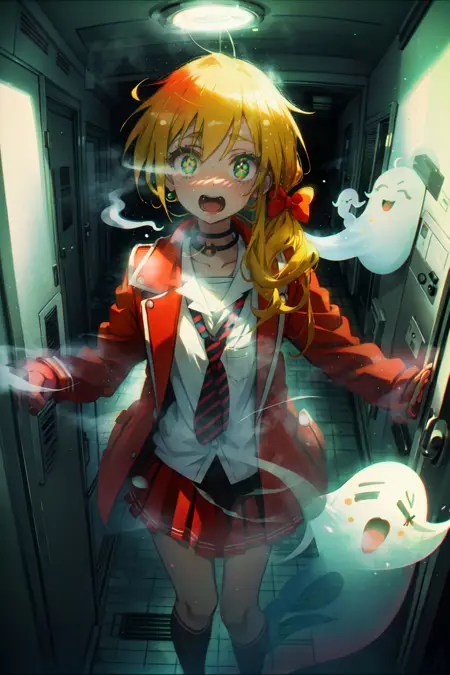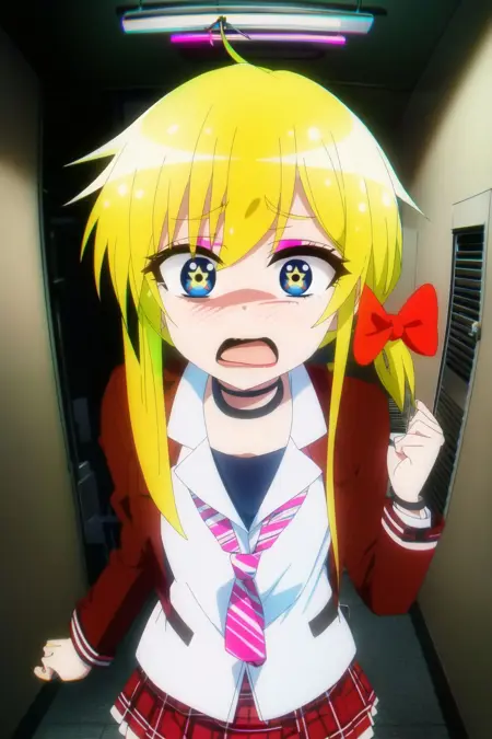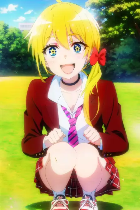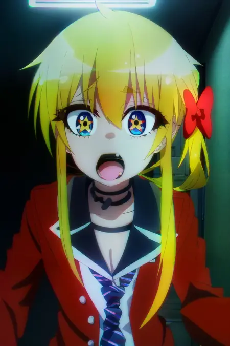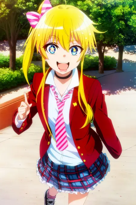 lora:kamiyoai1.2_SD:0.75 kamiyoai, 1girl, 금발, 빨간 리본, 사이드 포니테일, 파란 눈, 별 모양 동공, 송곳니, 빨간 코트, 체크무늬 치마, 분홍 컨버스, 넥타이, 목걸이