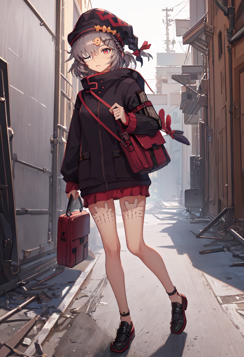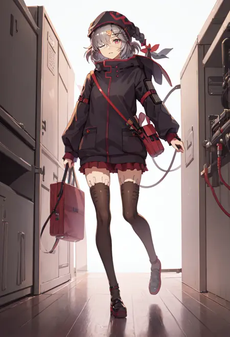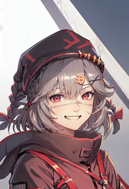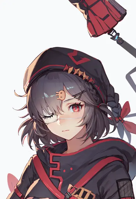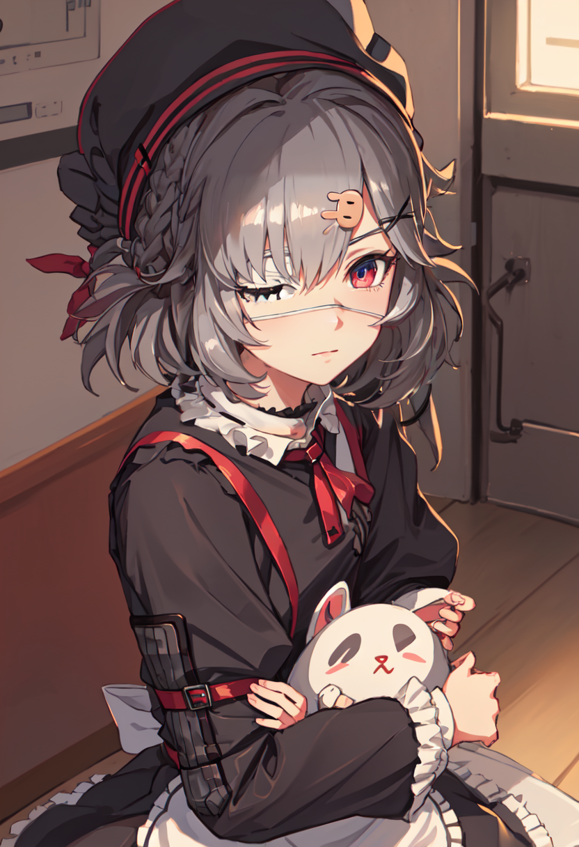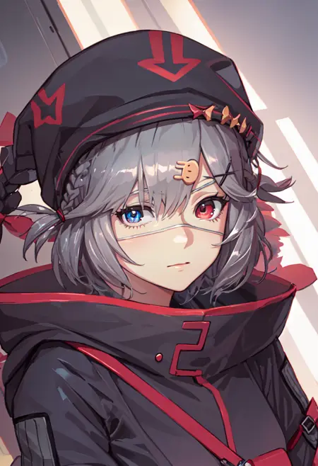 触发词为 popukar_arknights,精简标签为 hair_ornament, eyepatch, hat, red_eyes, black_headwear, grey_hair, hairclip, x_hair_ornament, medical_eyepatch, short_hair, rabbit_hair_ornament, bow, braid当某些特征(例如发色)在部分情况下不够稳定时,您可以将这些标签添加到提示词中