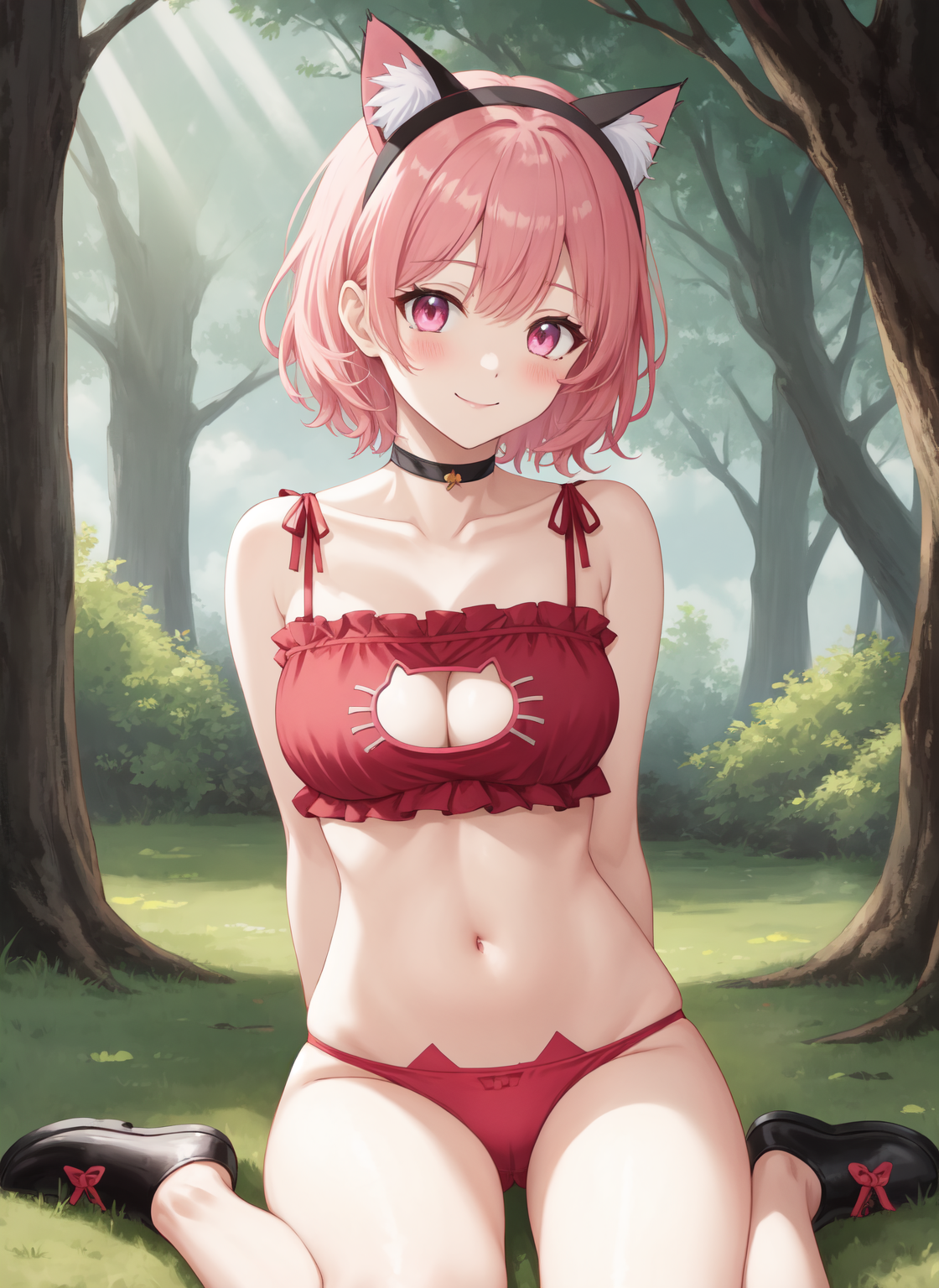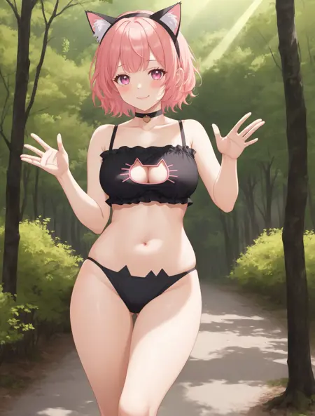 black bra, black panties, bow, animal ears, bare shoulders, underwear, collarbone, panties,frills, choker, cat ears, bra, clothing cutout, fake animal ears, cleavage cutout, underwear only, meme attire, frilled bra, cat cutout, cat lingerie, cat ear panties, paw shoes