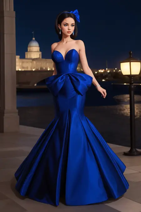 关键词:hud_blu_gwn ,皇室蓝丝缎无肩带礼服,无袖鱼尾晚礼服,前腰中央蝴蝶结,细带高跟鞋
