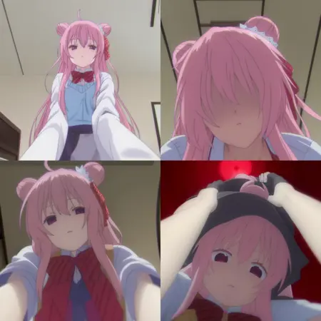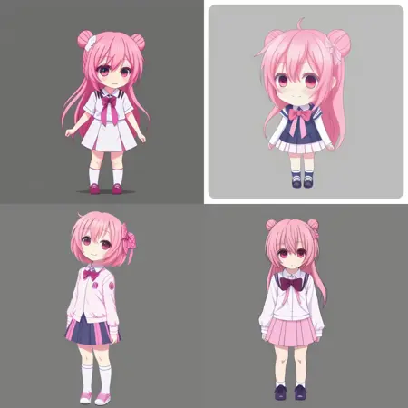 학교 복장: 분홍 헤어스타일, 단}`, 흰 셔츠, 스웨터 베스트, 초록 바지