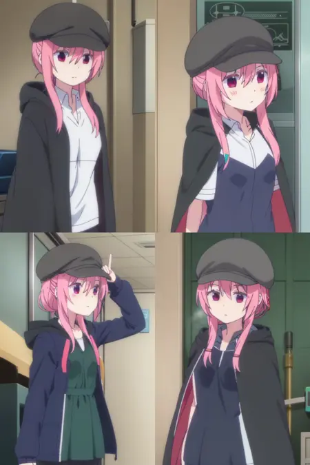 메인 의상: 분홍 헤어스타일, 단}`, 파란 자켓, 초록 바지