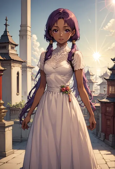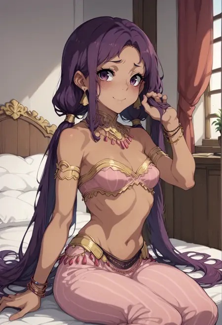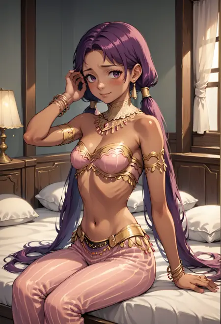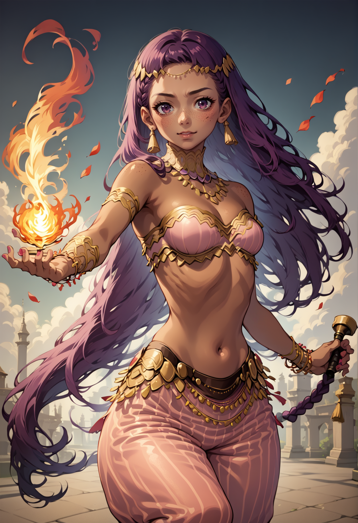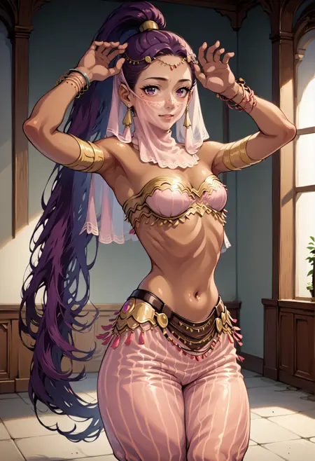 显著标签:极长发、高马尾、紫色头发、紫色眼睛、雀斑、灯笼裤、阿拉伯服饰、珠宝、肚脐、指甲油、手镯、舞者、裸露肩膀、耳环、面纱
