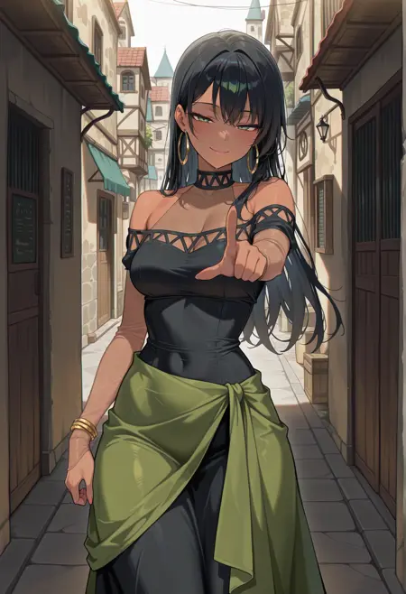 dark skin, long hair, black hair, green eyes, earrings, jewelry, black dress, see-through sleeves, bare shoulders, green sarong