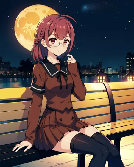 カジュアル衣装: mgrctokiwananaka, nnkcsl、ミディアムヘア、ハーフアップの編み込み、眼鏡、赤いシャツ、黒いセーラー襟、黒いネックリボン、短い上着に長い袖、赤いプリーツスカート、黒のスソハイズ