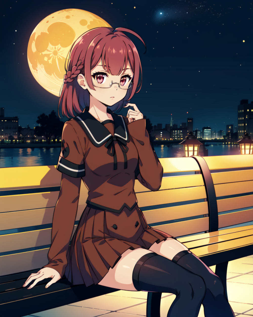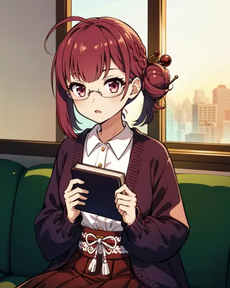 冬季服装: mgrctokiwananaka, nnkwtr, 发髻, 眼镜, 红色发夹, 白色衬衫, 棕色开衫, 粉色蝴蝶结, 红色袴裙, 红色腰带, 黄色带饰