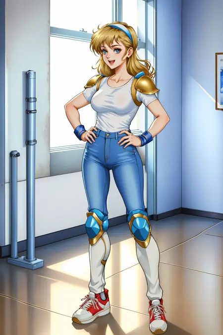 来自一款现已鲜为人知的1990年代打斗游戏《卧底警察》的角色。提示词为“RosaFelmonde”,描述其游戏服装:“发带、腕带、白色T恤、牛仔裤、腿套、护膝、护肩”等。