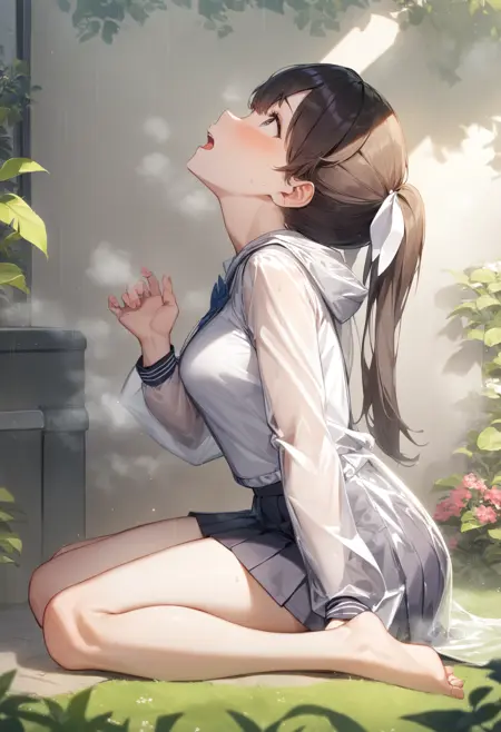 原本该提示本身是有效的,但似乎被识别为“裸体雨衣”,导致下方呈现肤色,现已修正为服装。由于同时学习了短袖和长袖,可能会出现长袖衣服的袖子部分易透出皮肤,或短袖衣服只在手腕处描绘袖子的情况,请通过抽卡尝试调整。