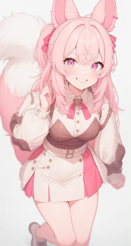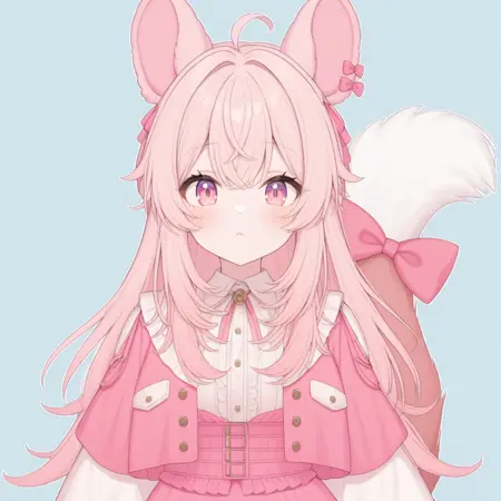ベースプロンプト: pippa, 兎の耳, 前髪, バーチャルユーチューバー, ピンクの髪, ピンクの目, あほ毛, 視聴者を見つめる, 髪の飾り,