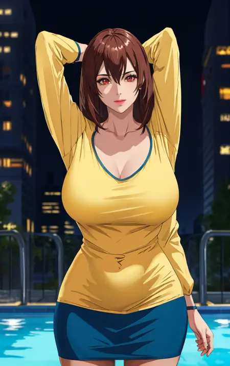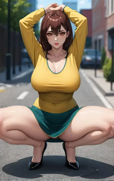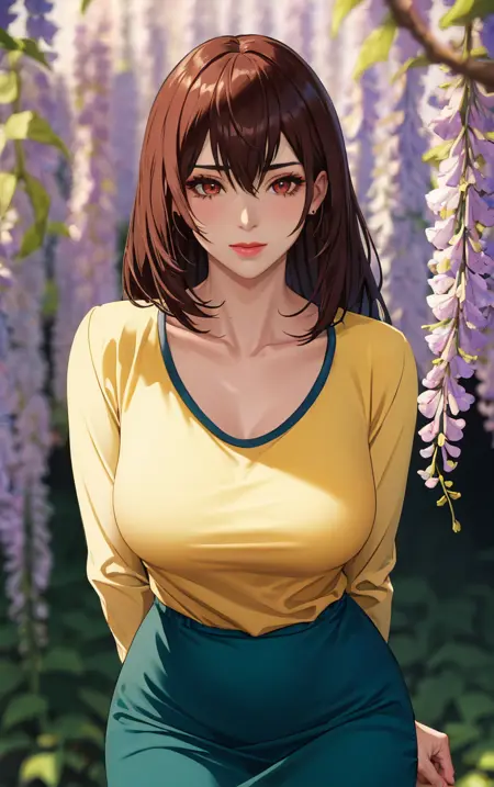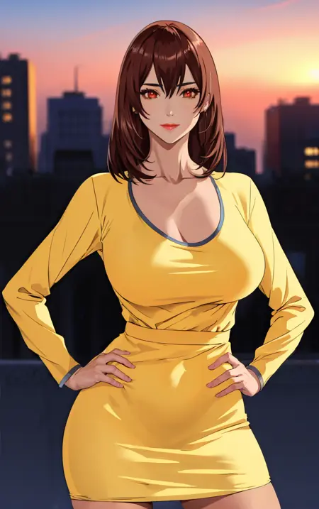 yellow shirt, collarbone, long sleeves, dress, pencil skirt,