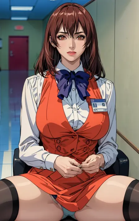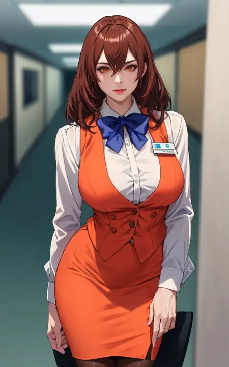 orange vest, name tag, vest, blue bow, long sleeves, pencil skirt, bowtie, see-through legwear, formal, white shirt, office lady,