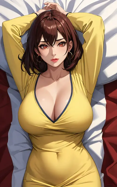 1girl, brown hair, red eyes, long hair, lipstick, earrings, makeup, lips, bangs, hair between eyes, large breasts, shiny hair,