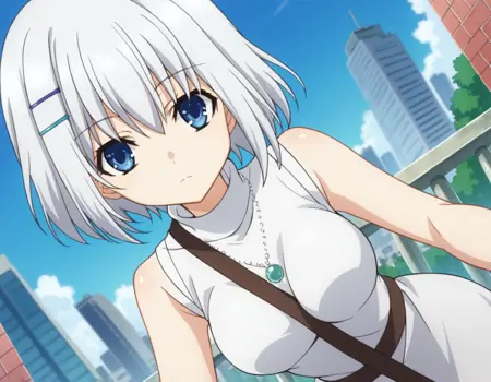 origami tobiichi 休闲装,短发,蓝眼睛,发饰,露肩,珠宝,白发,无袖,发夹,项链,高领,无袖高领,胸间带子,白裙,