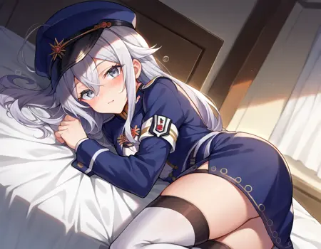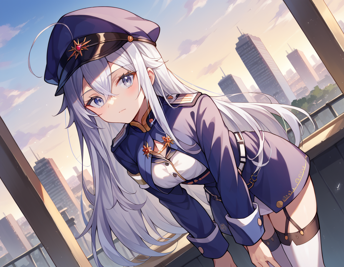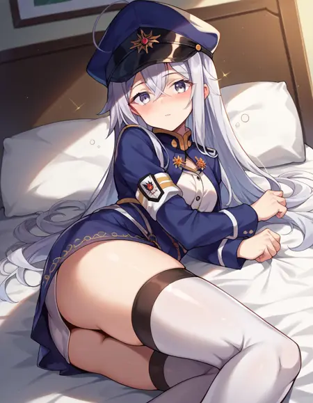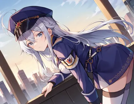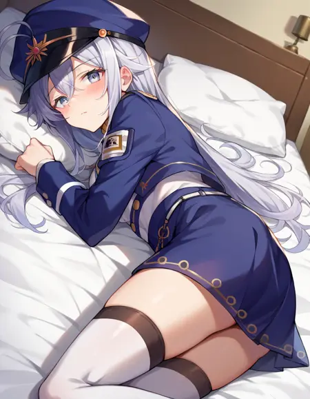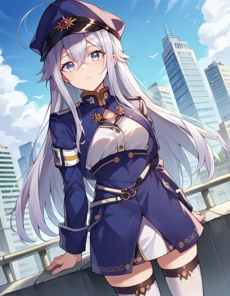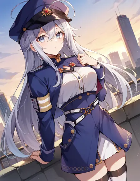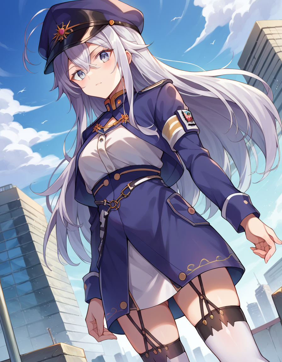 蓝色头饰,蓝色夹克,蓝色裙子,帽子,夹克,军事,军帽,军装,尖顶帽,衬衫,裙子,过膝袜,制服,白衬衫,白色过膝袜,