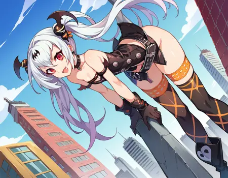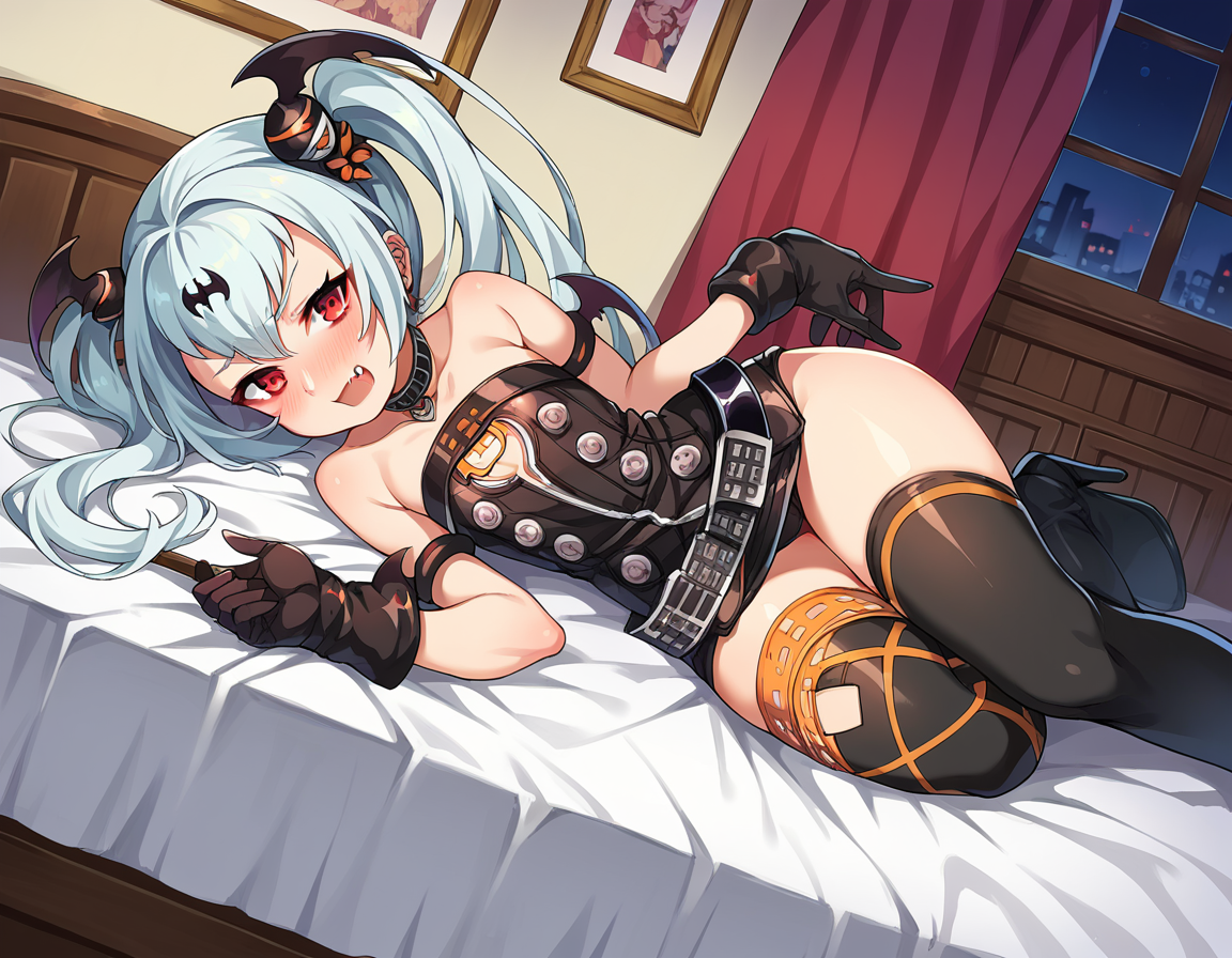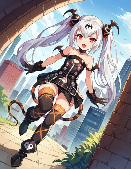 belt, belt skirt, black thighhighs, boots, choker, gloves, head wings, high heels, studded belt, studs, thighhighs, wings,