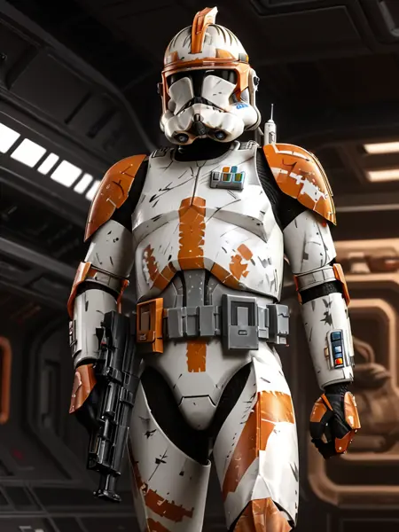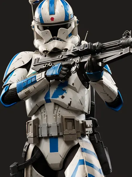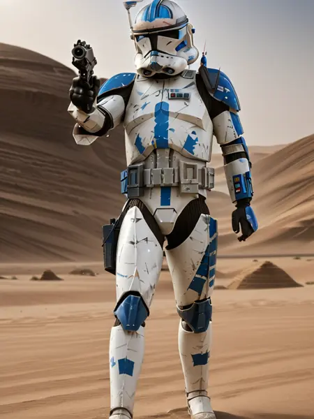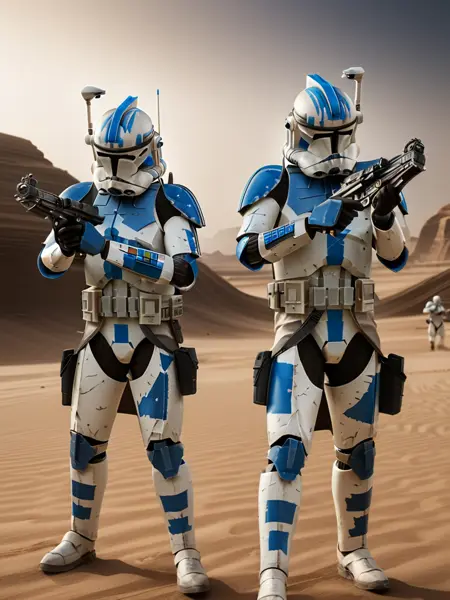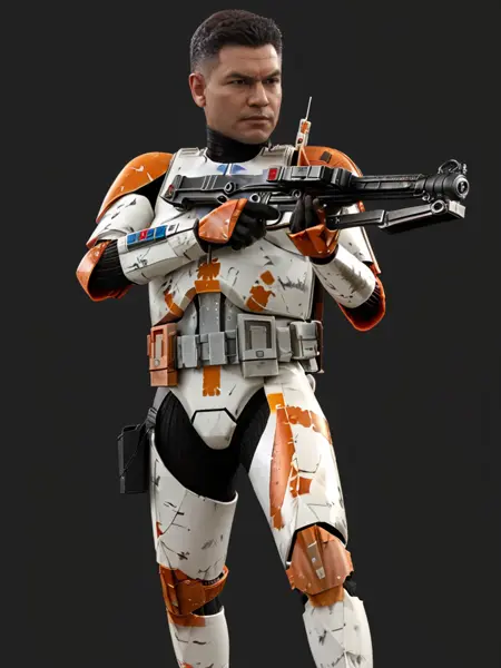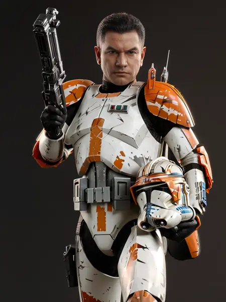 スター・ウォーズのクローン・トゥルーパーは、高品質な3Dモデル、一部の収集用おもちゃ、数枚の映画のスチール写真、そして指揮官・コディの実際の顔を含む約15枚の画像でトレーニングされています。最も人気のある装甲の塗装色であるオレンジと青を含みます。クローン戦争の武器もトレーニングに使用されているため、多数の優れたライフルやブラスターが参照されており、多くの画像がスター・ウォーズ風に正確に再現されています。