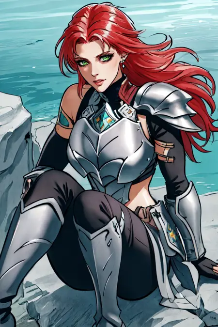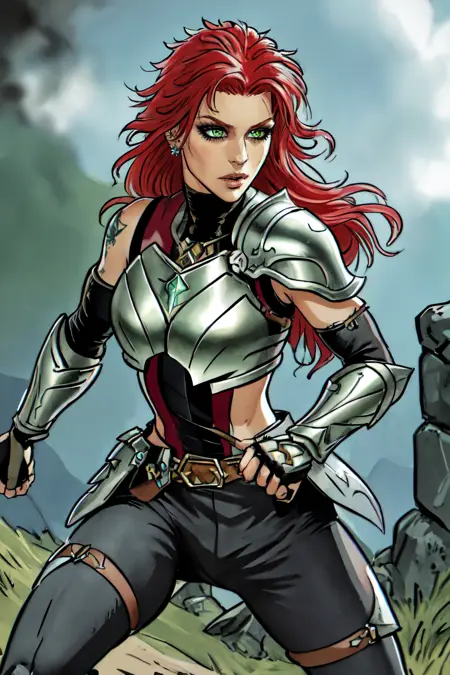 트리거 은색 갑옷: 1소녀, 빨간 머리, 긴 머리, 녹색 눈, 메이크업, 손가락 없는 장갑, 문신, 은색 벨트, 귀걸이, 가슴갑옷, 부츠, 어깨보호대, 검은 바지, 장갑