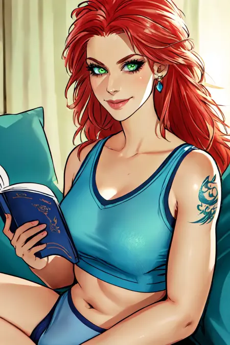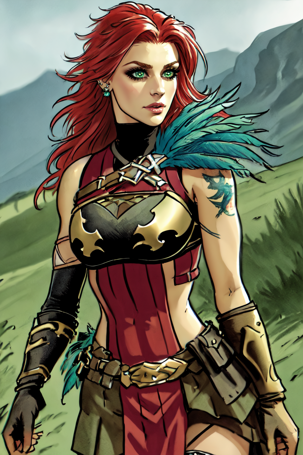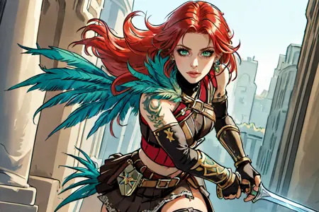 트리거 일반 복장: 1소녀, 빨간 머리, 긴 머리, 녹색 눈, 메이크업, 상의, 왼쪽 어깨의 깃털, 깃털, 손가락 없는 장갑, 문신, 갈색 벨트, 팔빵, 갈색 비대칭 하의, 깃털이 달린 검은 치마, 귀걸이, 빨간 골반 커튼