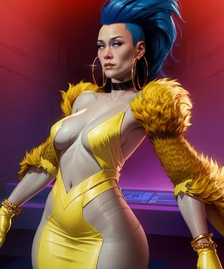 yellow dress, or gold dress, yellow fur trim detached sleeves, or sleeve fur, navel, cleavage, hoop earrings, choker, necklace, collarbone, gloves, bracelet,