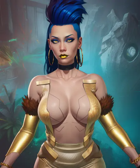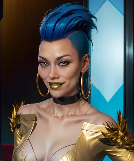 妆容为特定/随机生成——金色嘴唇或金色口红,白色睫毛膏,白色眼线,白色眼影,白色眼部彩绘——可能需要提高权重或使用Neg以确保准确——唇色可能影响牙齿颜色——建议在Neg中加入“黄牙”